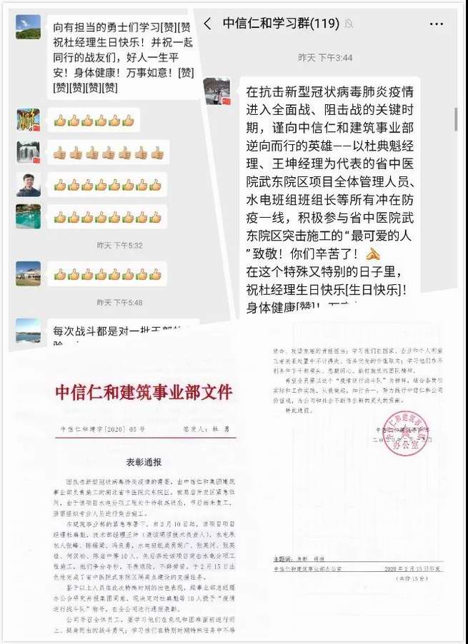 包括董事長杜勇在內的多名集團管理層對省中醫院武東院區項目組人員表示了嘉獎并號召全體家人學習他們不畏艱險、勇于擔當、團隊作戰的寶貴精神和能打勝仗的決心,集團也對此發文通報表彰,授予項目組“疫情逆行戰斗隊”稱號。