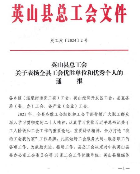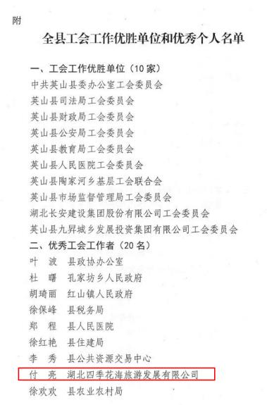3月底,英山縣總工會發出《關于表揚全縣工會優勝單位和先進個人的通報》,10家工會工作優勝單位、20名優秀工會工作者獲得表彰。四季花海公司工會委員付亮系企業工會獲獎者代表,體現出上級工會對企業工會的支持和工作肯定。