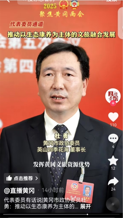 在1月7日的首場代表委員通道專訪時,市政協委員、湖北四季花海旅游發展有限公司董事長杜勇表示,要把資源優勢轉化為發展優勢,突破性發展文旅業,推動以生態康養為主體的文旅融合發展。
